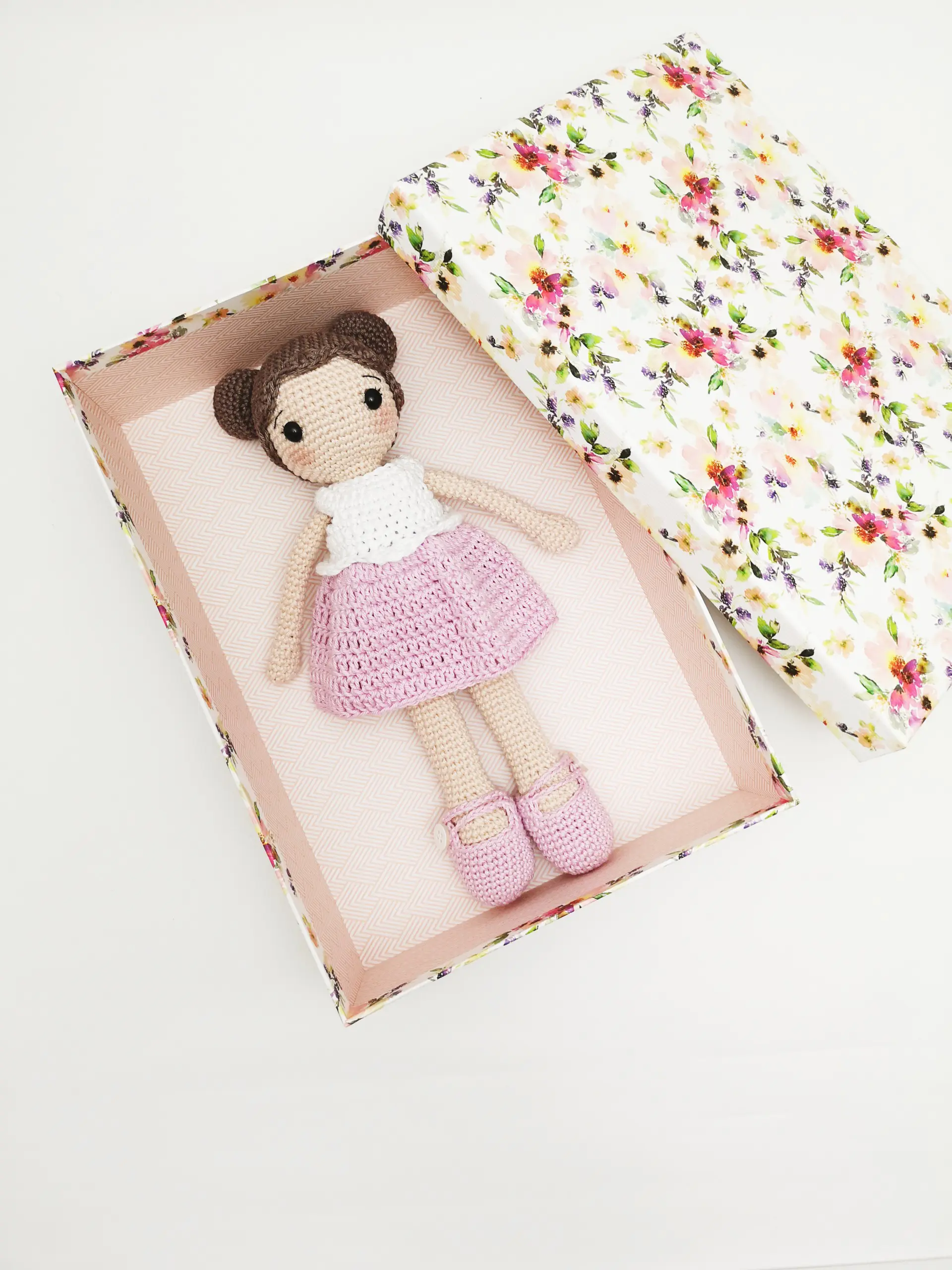Yarn dk: brown, white, a little of pink and a little of dark brown; crochet hook 3 mm, safety eyes 6 mm, stuffing, tapestry needle.