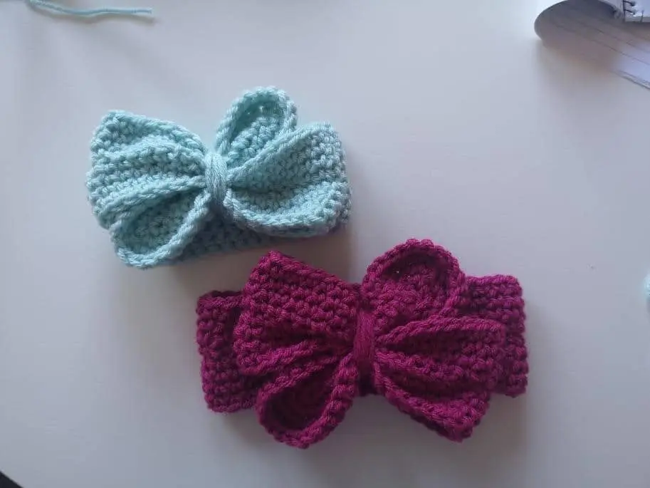 This pattern is made in 2 sections, one section is for the bow headband made with #5 bulky yarn and 6mm hook. The second part of the pattern is made so that you can choose to work with any yarn and hook size you want.