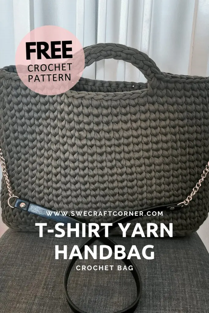 This crocheted handbag works just as well as a crocheted tote or a laptop bag. I do not however recommend it to smaller children since t-shirt yarn tends to weigh a bit more the regular yarn. But it’s the perfect gift to make for a college student.