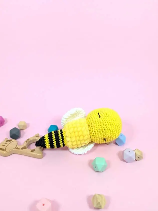 This is my Bee toy rattle pattern. It’s so adorable and easy for a child to hold and carry. This crocheted baby toy will help the child feel secure and beloved. And makes for some super cute baby photos! It’s made with a super soft chenille yarn and cotton yarn.